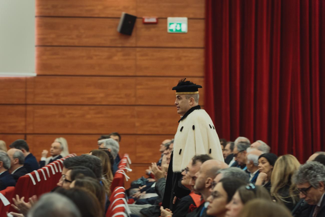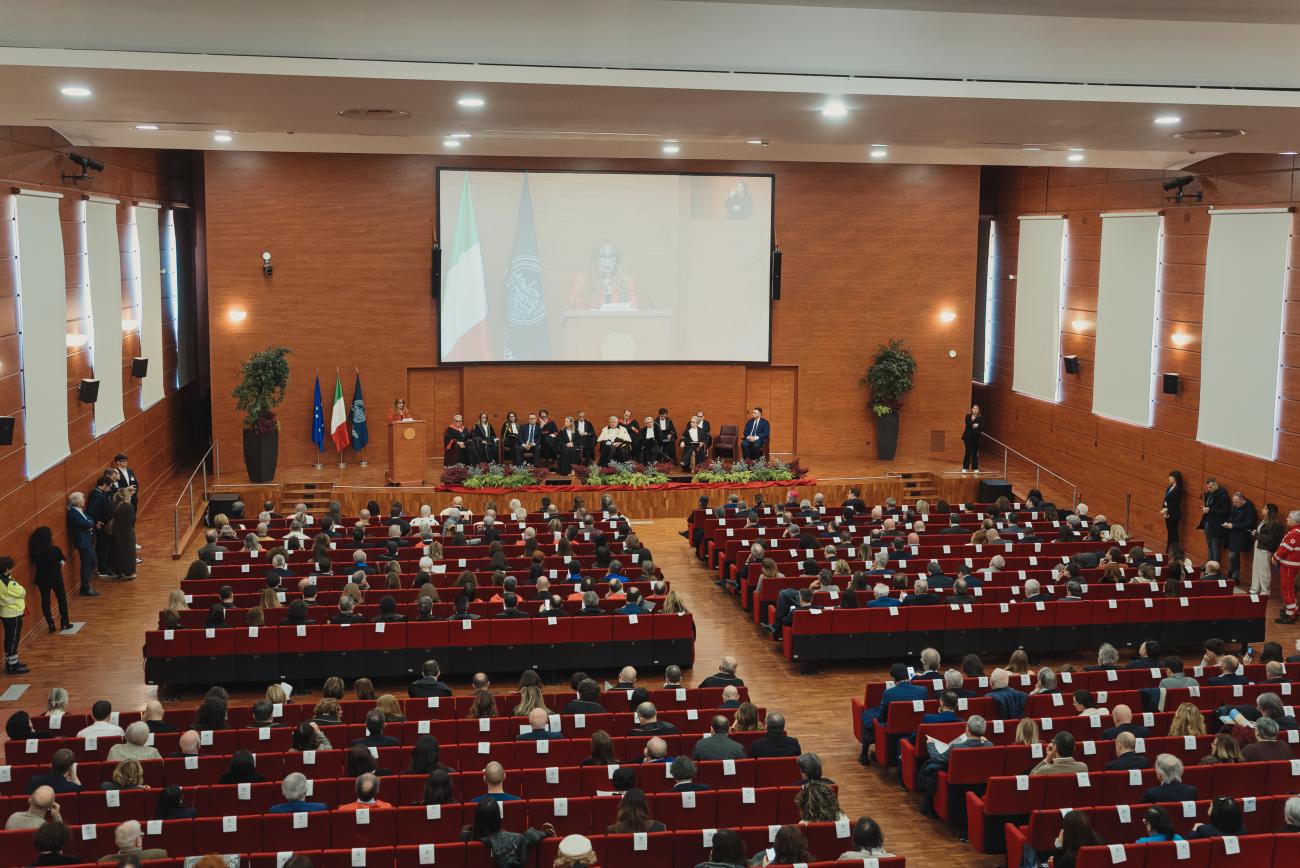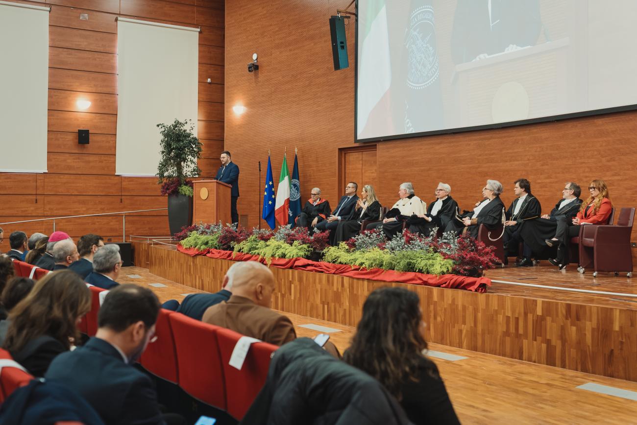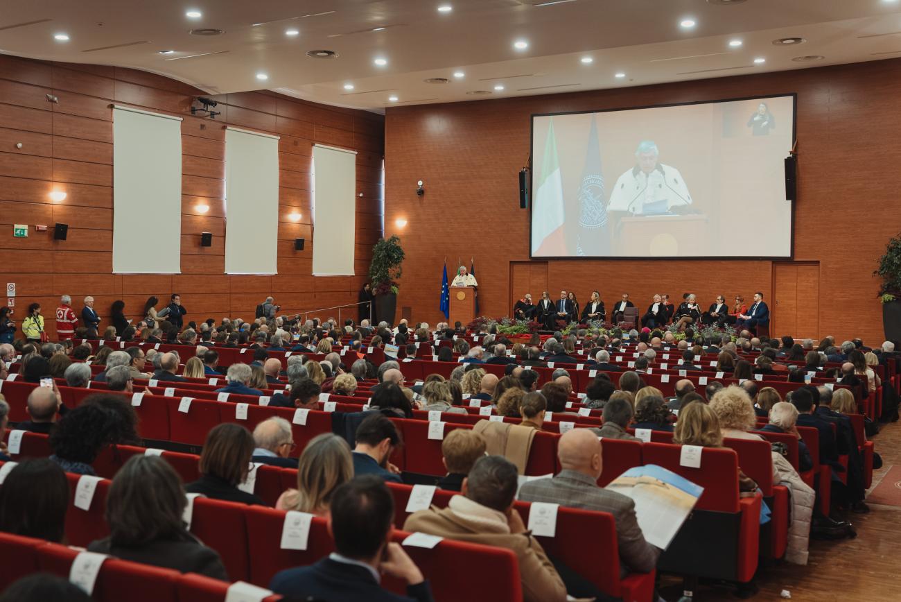 Come da tradizione, il primo intervento è stato quello del Magnifico Rettore, Lorenzo Lo Muzio, che ha presentato una relazione incentrata sul Piano strategico dell’Ateneo, definito come “una promessa reciproca” tra Istituzione, Comunità accademica e Territorio. “La nostra Università, ancora giovane, possiede una qualità rara e preziosa: la capacità di immaginare, e in venticinque anni di storia abbiamo dimostrato che, anche in contesti complessi, è possibile costruire eccellenza, creare opportunità e attrarre nuove energie. Oggi siamo chiamati a un passo successivo: trasformare la crescita in rigenerazione, trovando il coraggio di cambiare senza perdere il senso della nostra missione, non accontentandoci di gestire l’esistente, ma costruendo ciò che ancora non c’è. Ed è forse questa la conquista più autentica di questi anni: aver compreso che una Comunità accademica non cresce per i risultati raggiunti, ma per la qualità delle domande che continua a porsi. Perché l’Università, nella sua essenza più profonda, non è il luogo della conservazione del sapere, ma il luogo in cui una società decide che vale ancora la pena comprendere il mondo prima di cambiarlo".