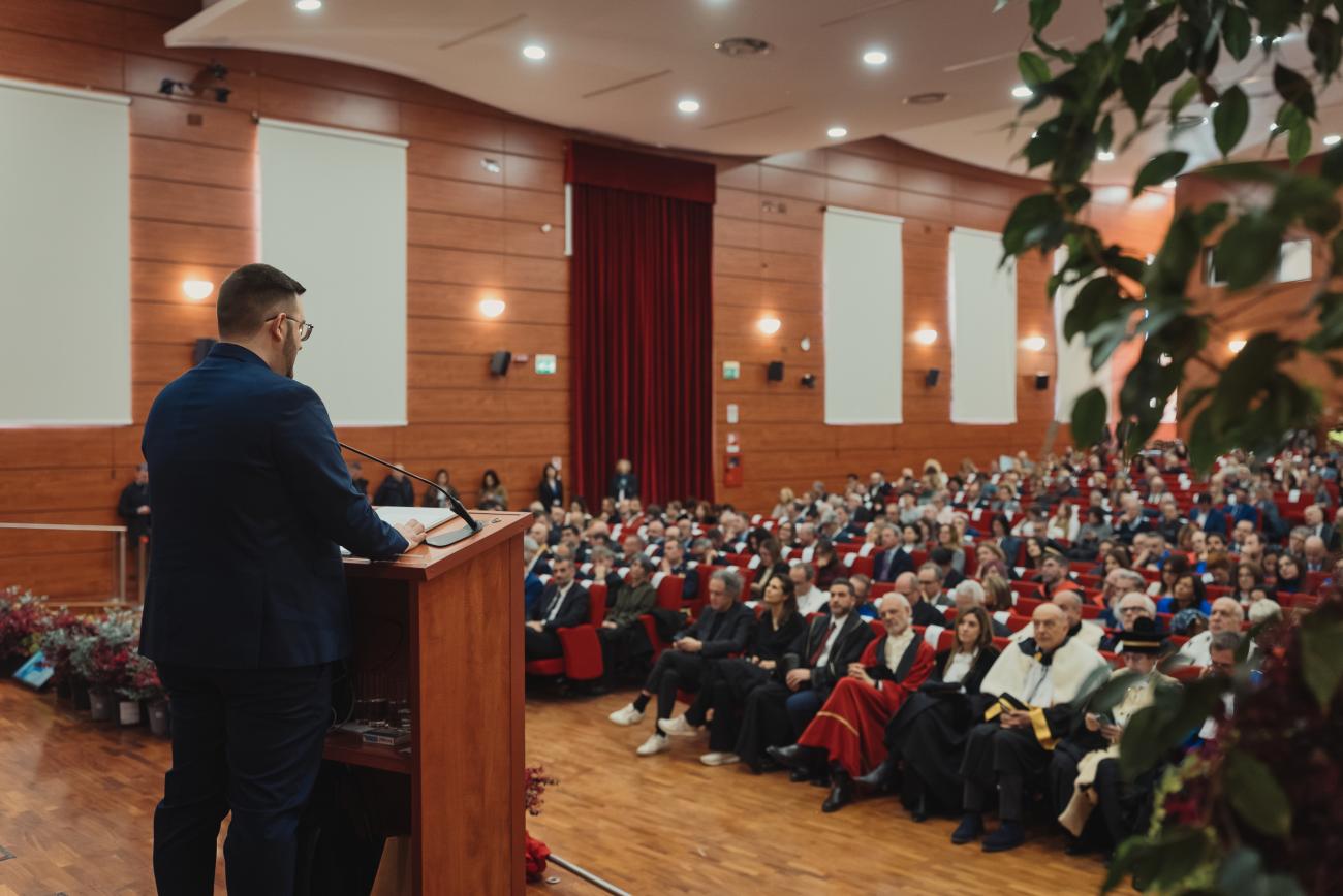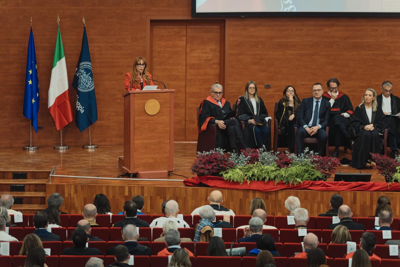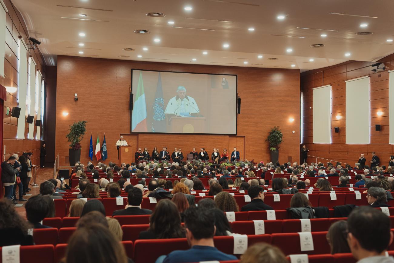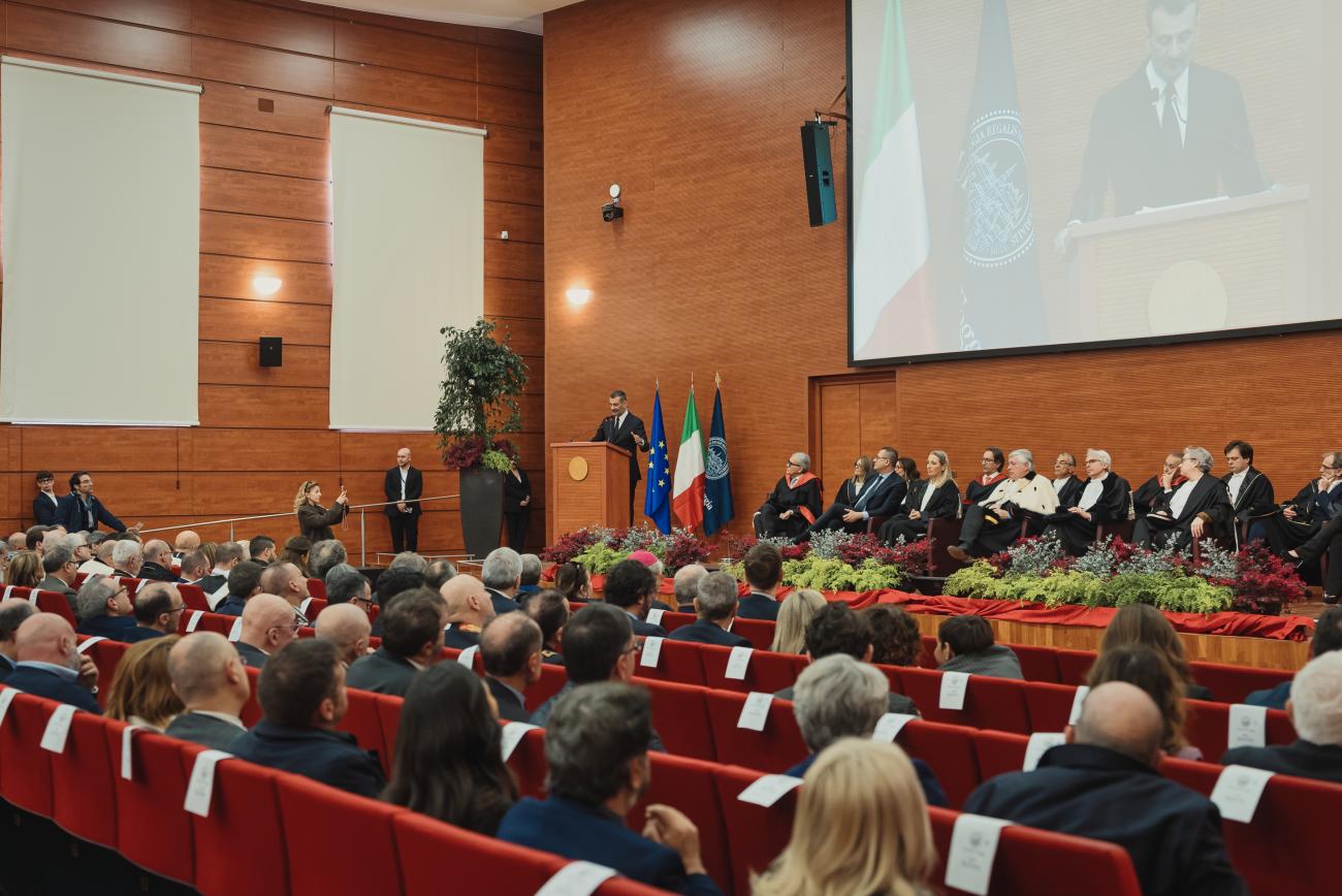 Come da tradizione, il primo intervento è stato quello del Magnifico Rettore, Lorenzo Lo Muzio, che ha presentato una relazione incentrata sul Piano strategico dell’Ateneo, definito come “una promessa reciproca” tra Istituzione, Comunità accademica e Territorio. “La nostra Università, ancora giovane, possiede una qualità rara e preziosa: la capacità di immaginare, e in venticinque anni di storia abbiamo dimostrato che, anche in contesti complessi, è possibile costruire eccellenza, creare opportunità e attrarre nuove energie. Oggi siamo chiamati a un passo successivo: trasformare la crescita in rigenerazione, trovando il coraggio di cambiare senza perdere il senso della nostra missione, non accontentandoci di gestire l’esistente, ma costruendo ciò che ancora non c’è. Ed è forse questa la conquista più autentica di questi anni: aver compreso che una Comunità accademica non cresce per i risultati raggiunti, ma per la qualità delle domande che continua a porsi. Perché l’Università, nella sua essenza più profonda, non è il luogo della conservazione del sapere, ma il luogo in cui una società decide che vale ancora la pena comprendere il mondo prima di cambiarlo".