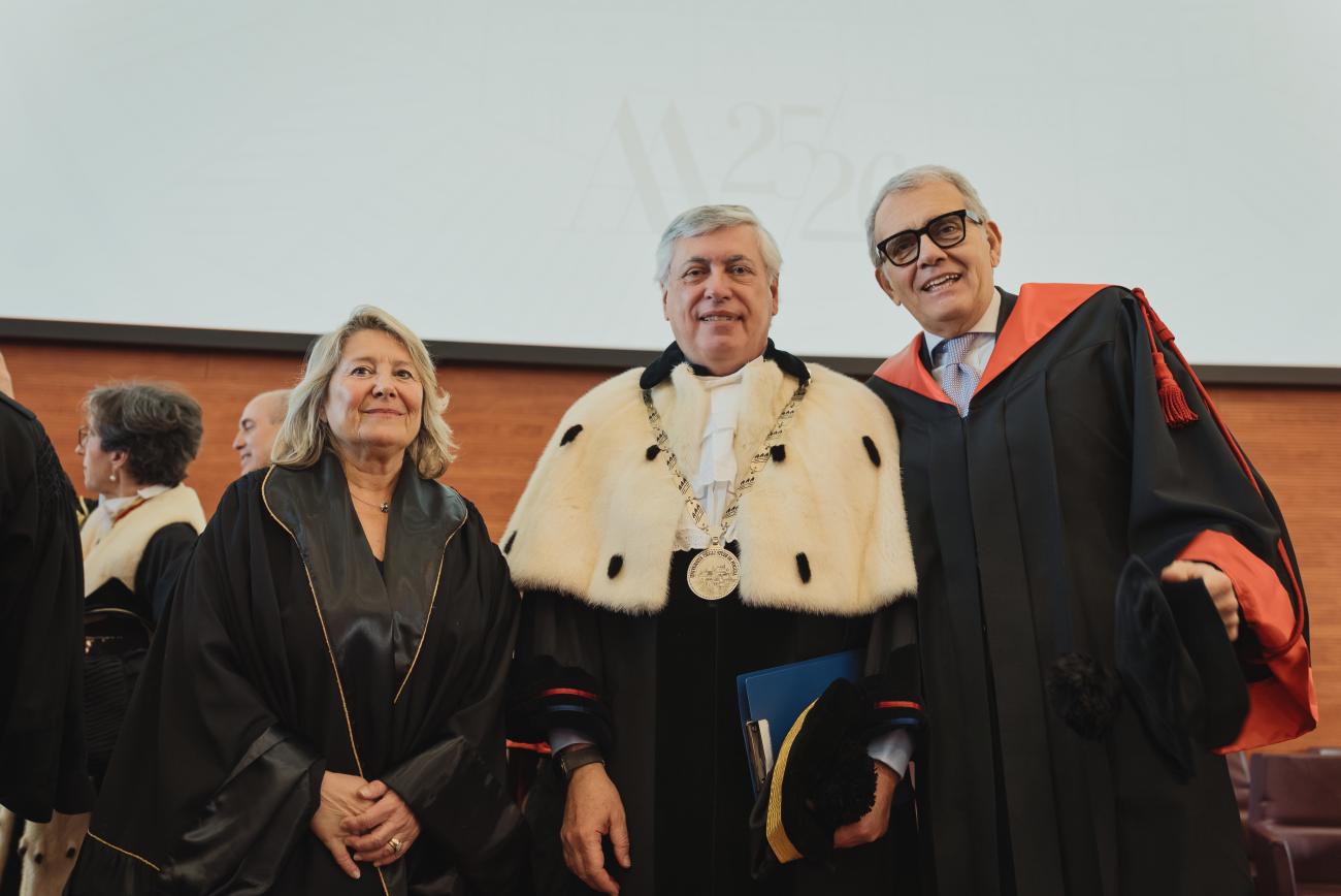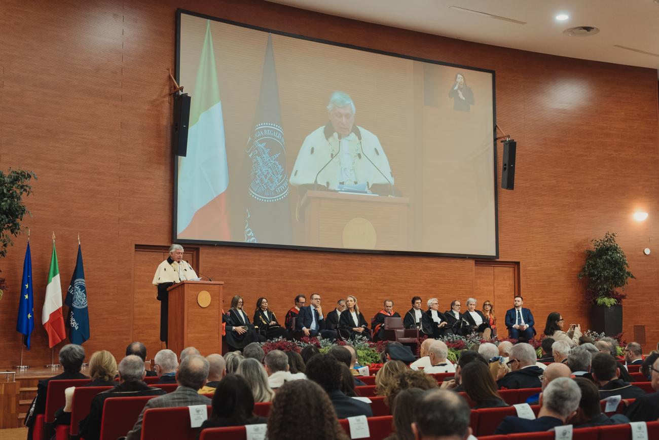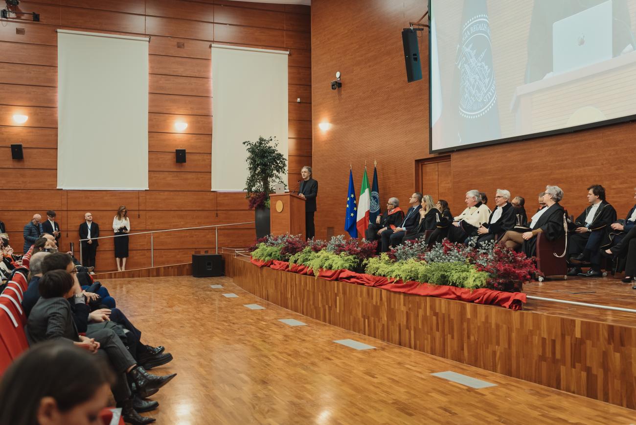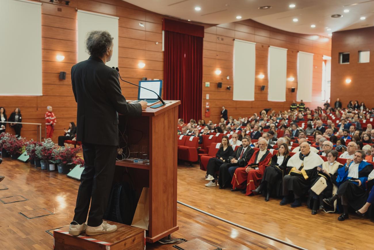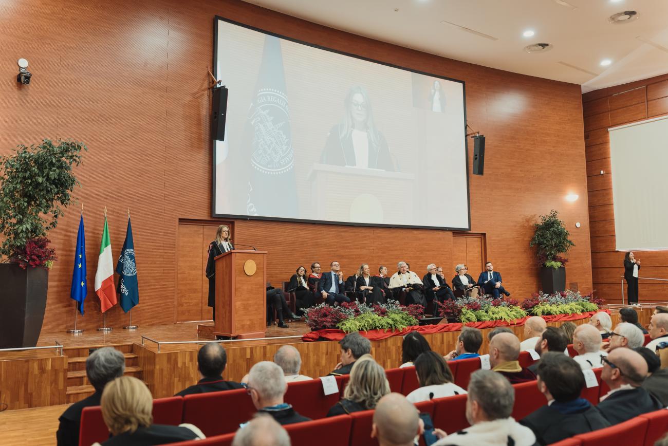 Come da tradizione, il primo intervento è stato quello del Magnifico Rettore, Lorenzo Lo Muzio, che ha presentato una relazione incentrata sul Piano strategico dell’Ateneo, definito come “una promessa reciproca” tra Istituzione, Comunità accademica e Territorio. “La nostra Università, ancora giovane, possiede una qualità rara e preziosa: la capacità di immaginare, e in venticinque anni di storia abbiamo dimostrato che, anche in contesti complessi, è possibile costruire eccellenza, creare opportunità e attrarre nuove energie. Oggi siamo chiamati a un passo successivo: trasformare la crescita in rigenerazione, trovando il coraggio di cambiare senza perdere il senso della nostra missione, non accontentandoci di gestire l’esistente, ma costruendo ciò che ancora non c’è. Ed è forse questa la conquista più autentica di questi anni: aver compreso che una Comunità accademica non cresce per i risultati raggiunti, ma per la qualità delle domande che continua a porsi. Perché l’Università, nella sua essenza più profonda, non è il luogo della conservazione del sapere, ma il luogo in cui una società decide che vale ancora la pena comprendere il mondo prima di cambiarlo".
