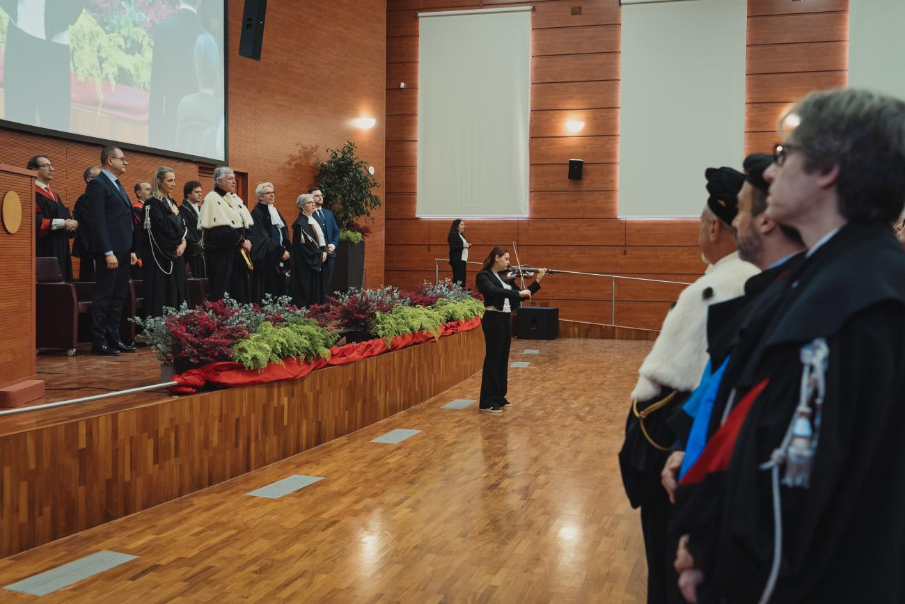 La cerimonia si è aperta con il tradizionale corteo accademico, che ha visto la partecipazione di numerose Università italiane rappresentate dai rispettivi Rettori, a testimonianza del forte legame che unisce l’Ateneo daunio al sistema universitario nazionale e con l’esecuzione dell’Inno italiano in una suggestiva versione per violino, interpretata dalla studentessa del Conservatorio “Umberto Giordano di Foggia” Silvia Laquintana.