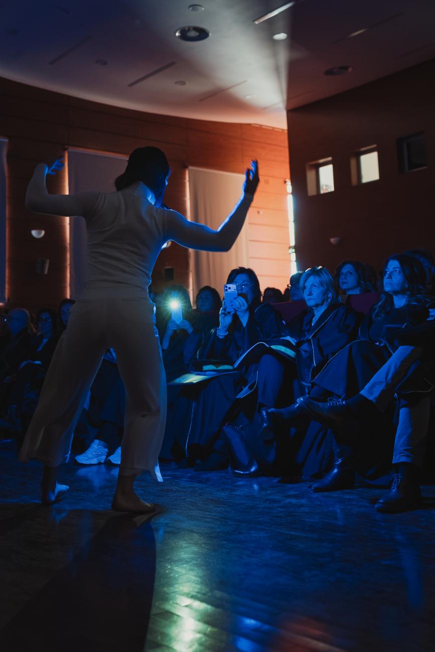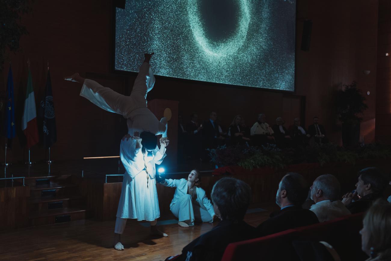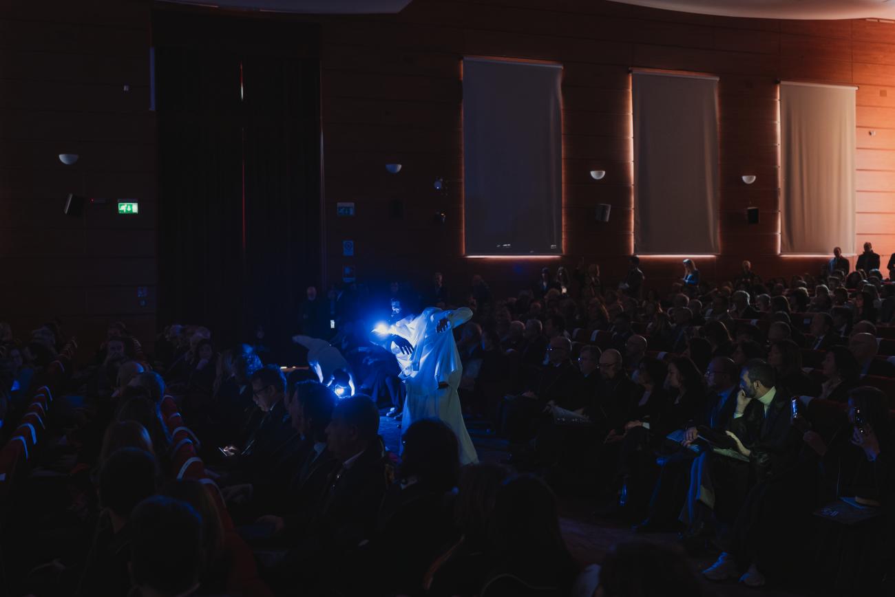A conferire all’evento un carattere distintivo e contemporaneo è stata la performance artistica della compagnia Eleina D, scelta volutamente innovativa rispetto al protocollo accademico. Attraverso un linguaggio espressivo capace di coniugare ricerca artistica e suggestione simbolica, la compagnia ha interpretato e anticipato il tema della visione, offrendo al pubblico una chiave di lettura originale e coinvolgente dell’intero evento.