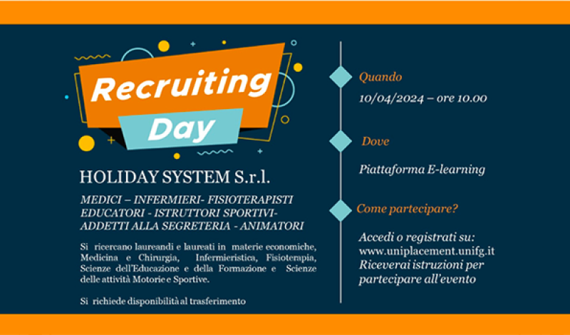 HOLIDAY SYSTEM SRL seleziona laureandi e laureati in MATERIE ECONOMICHE, MEDICINA E CHIRURGIA, INFERMIERISTICA, SCIENZE DELLE ATTIVITA' MOTORIE E SPORTIVE, FISIOTERAPIA e SCIENZE DELL'EDUCAZIONE E DELLA FORMAZIONE